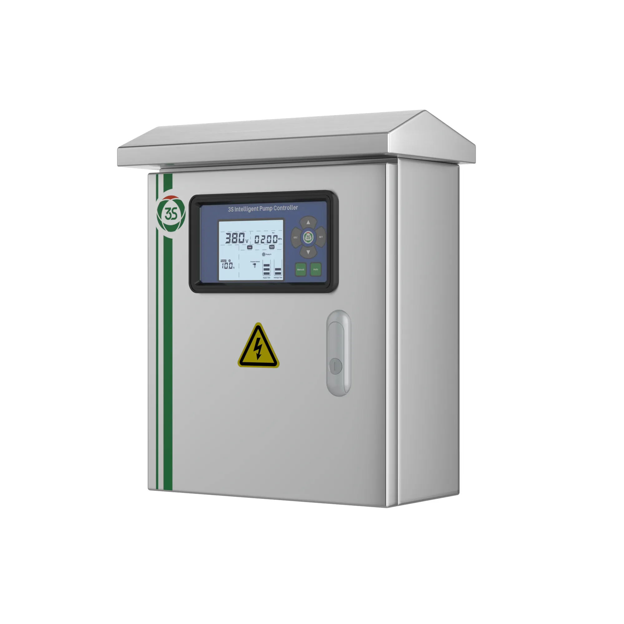 The LCD screen of the IP55 three phase pump control panel can display real-time operating status, voltage and current, water tower liquid level, fault codes and other information.