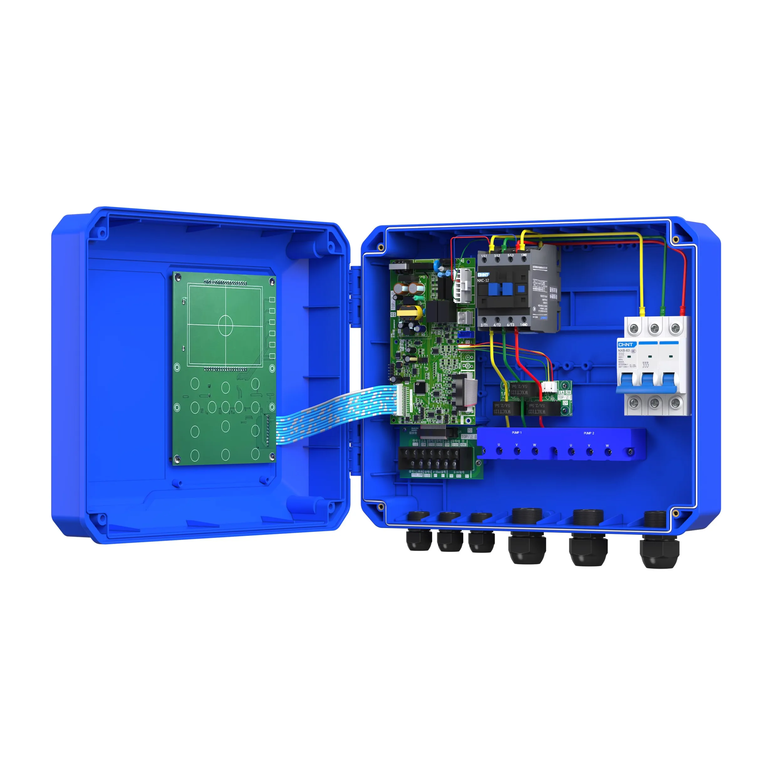 The enclosure is made of high-strength flame-retardant ABS engineering plastic, which is UV-resistant and anti-aging. This material ensures the intelligent pump starter can withstand long-term outdoor exposure.